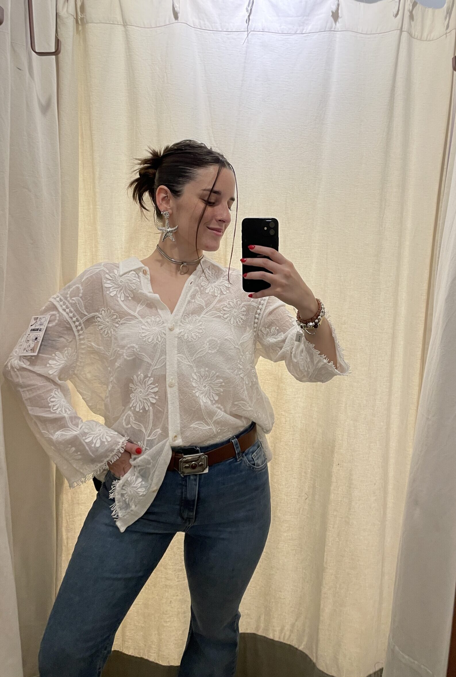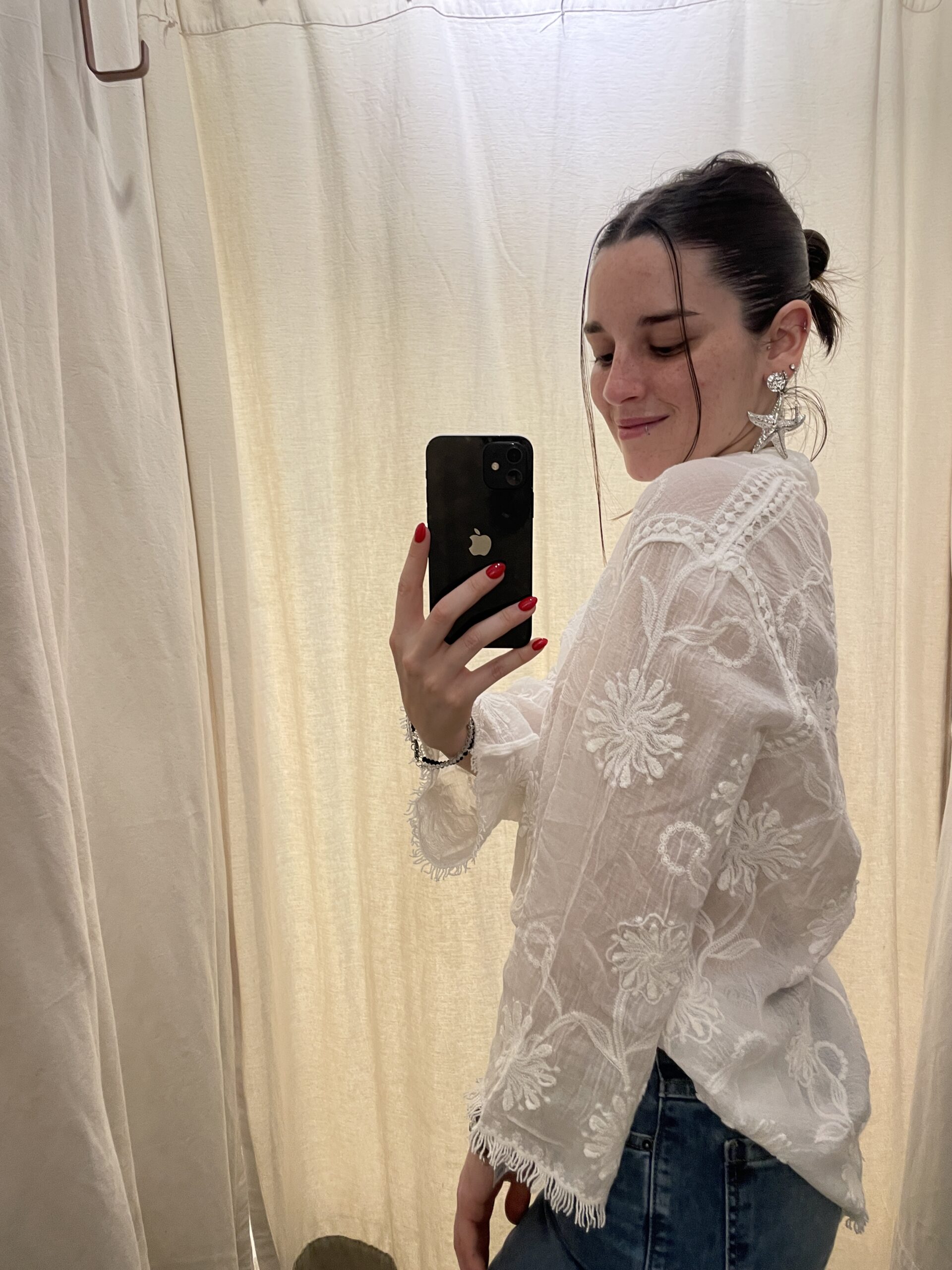 Camisa de corte recto con delicado bordado floral, botones al frente y diseño liviano. Excelente calidad de lino.