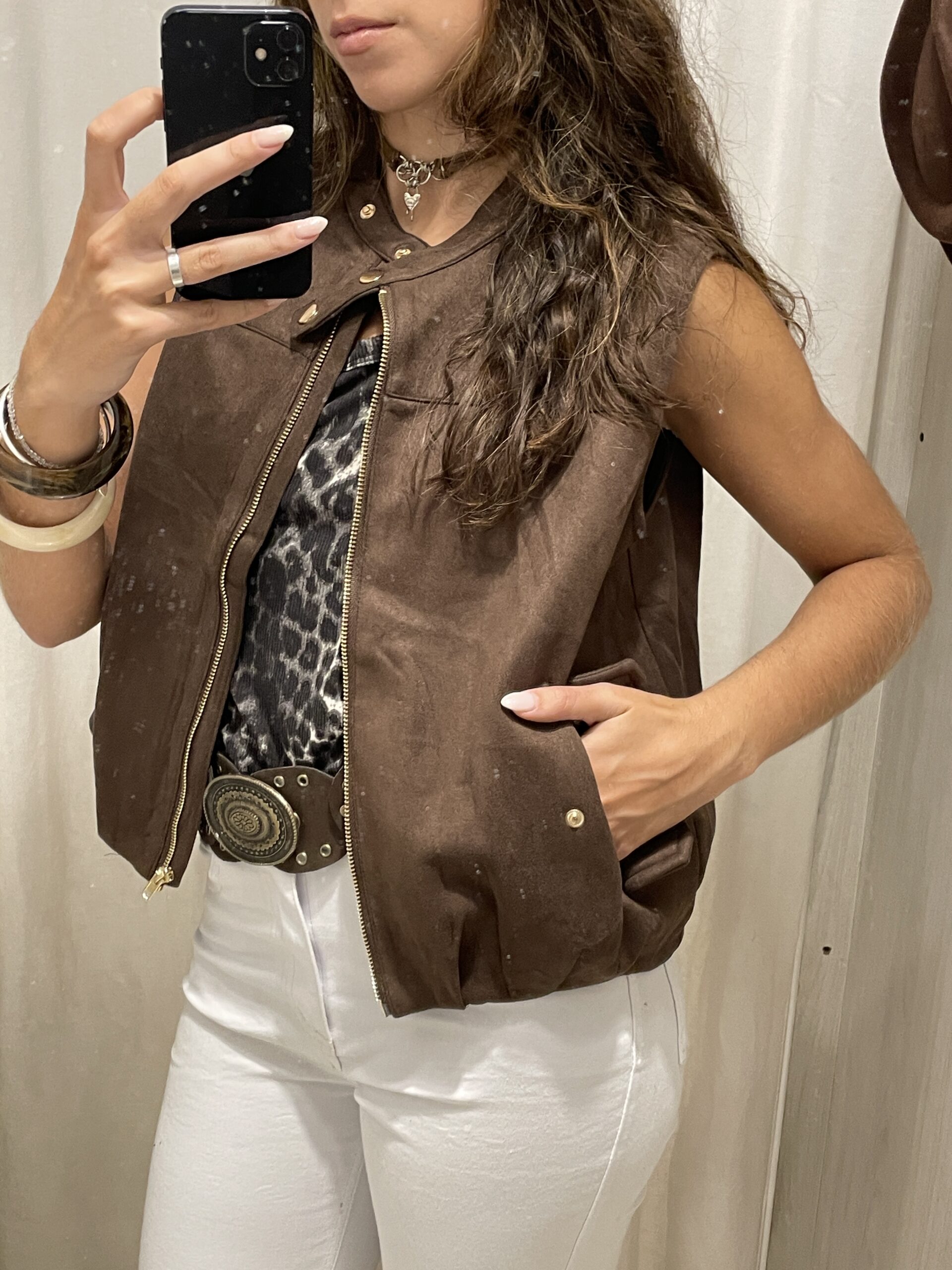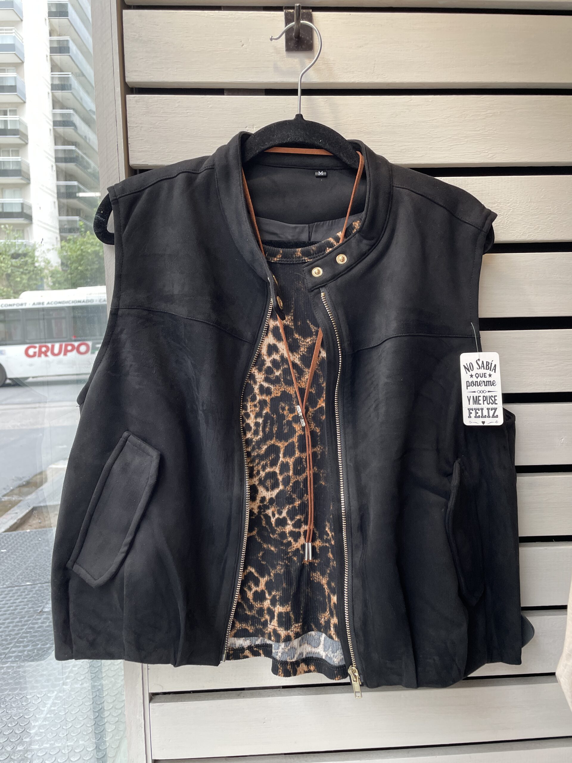 Chaleco gamuza forrado con bolsillos, cierre y botones en cuello.