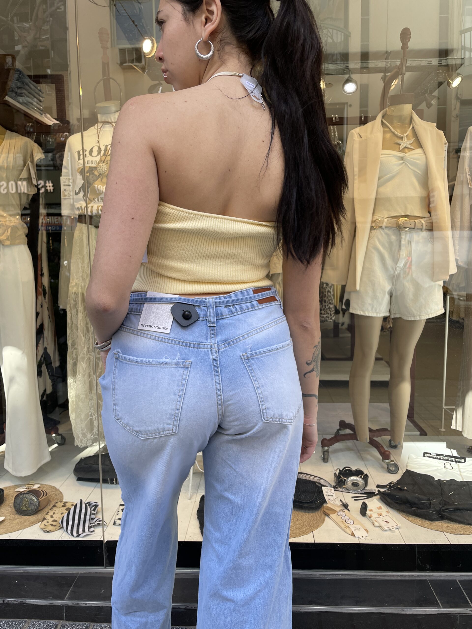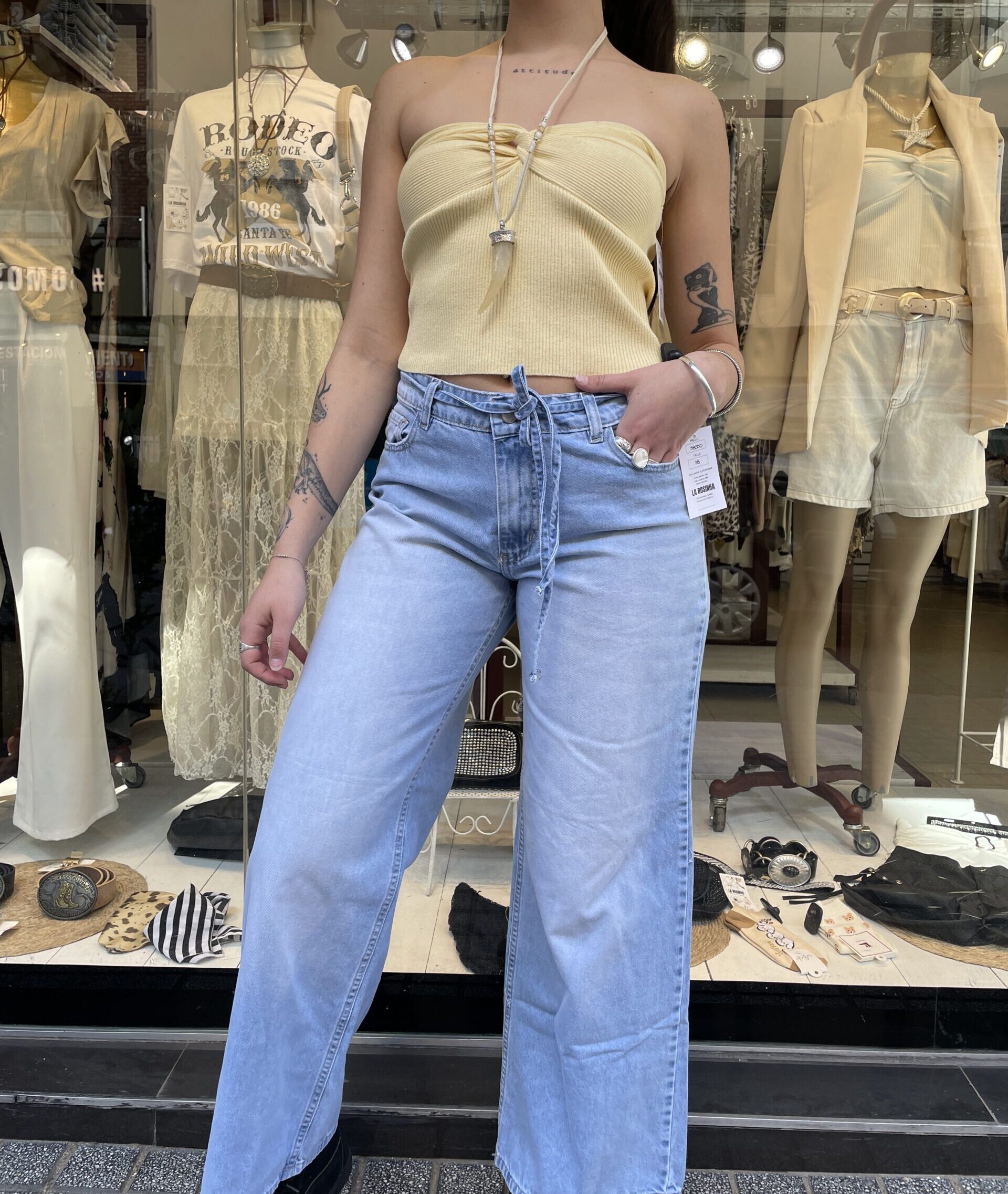 Jean rigido tiro alto de corte wide. Con detalle de lazo en la cintura.