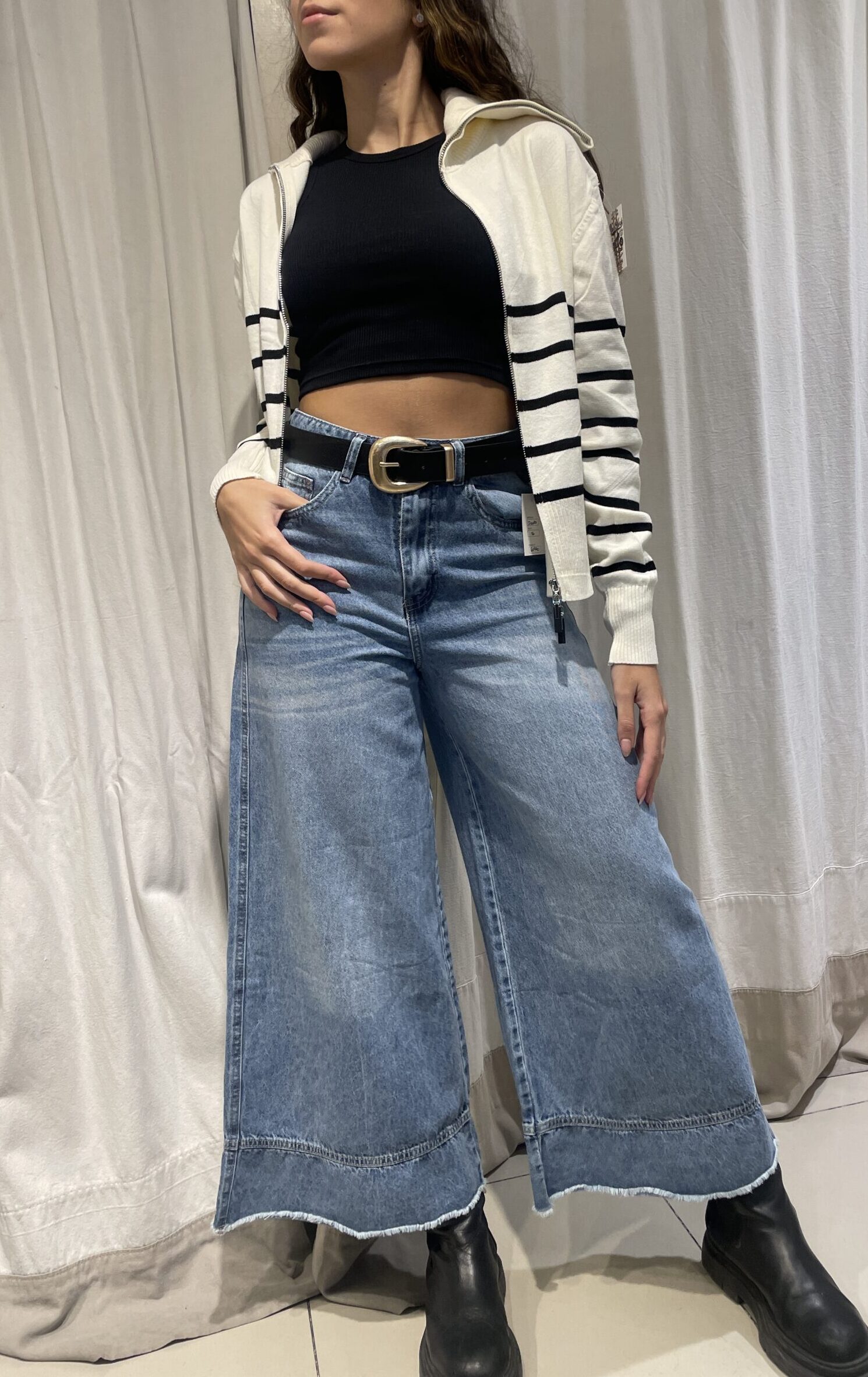 Jean wide leg rígido con costuras abajo.