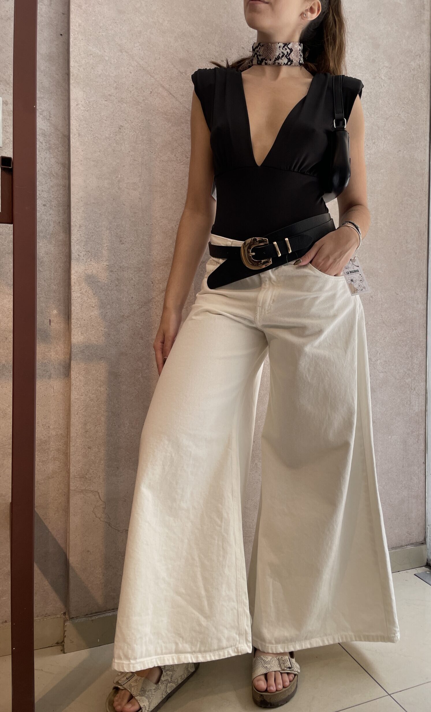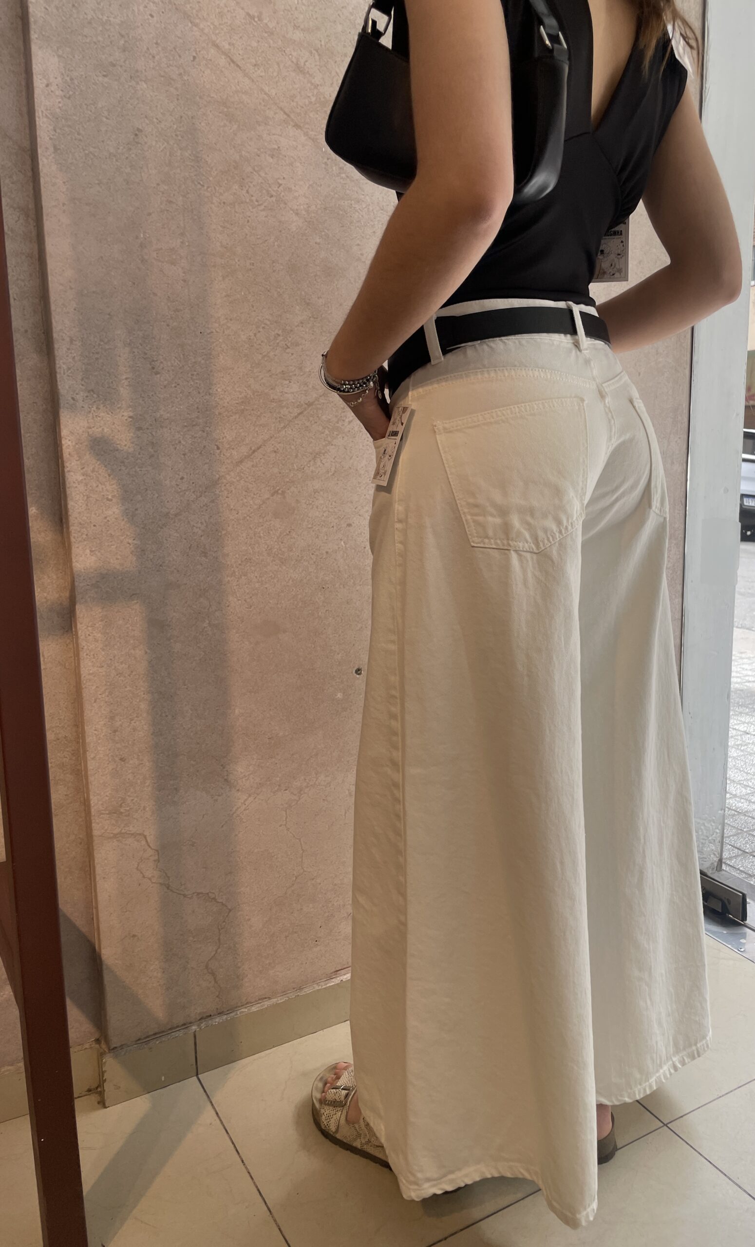Pantalon Blanco tiro medio con bota super ancha, excelente calce.