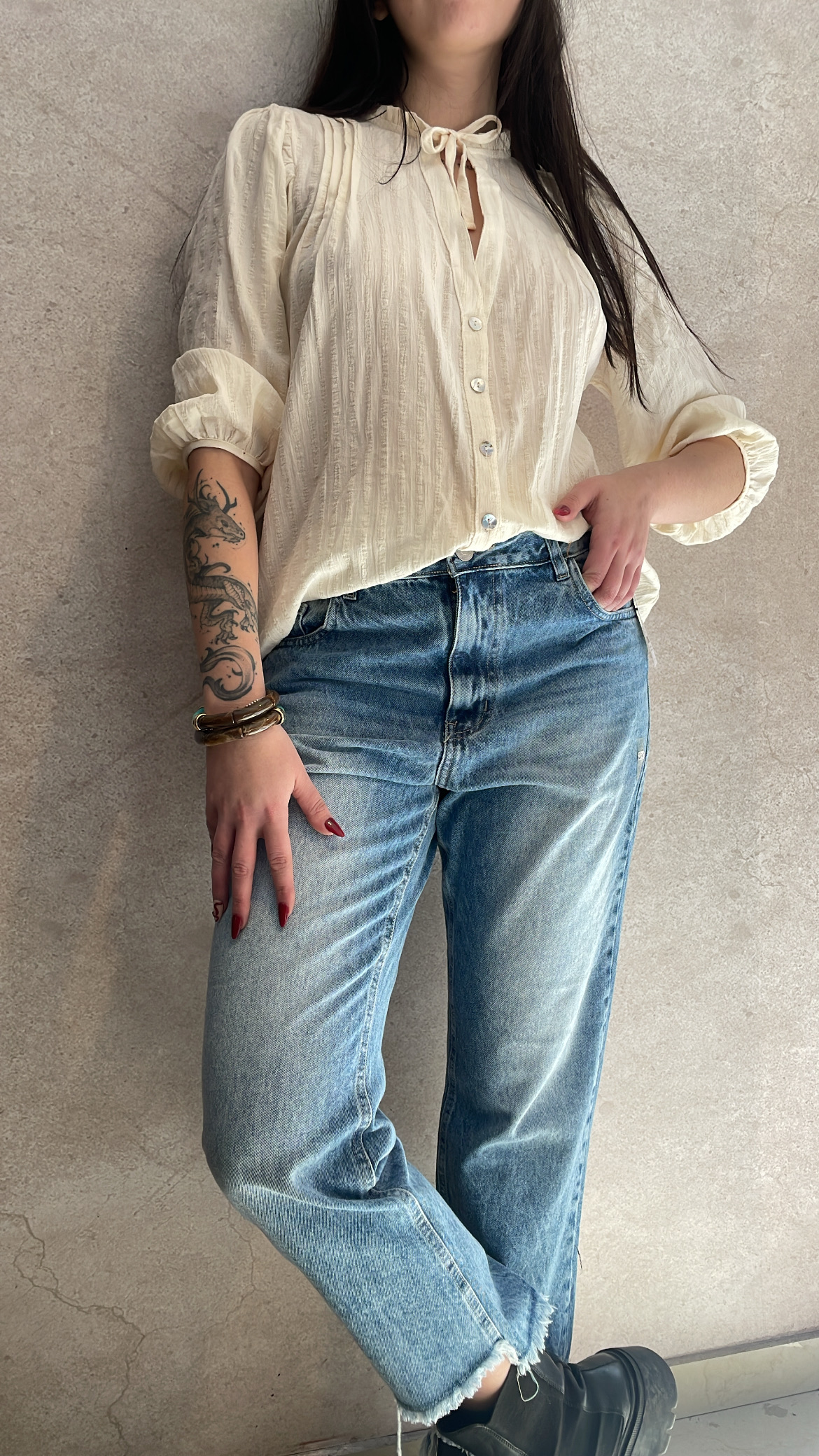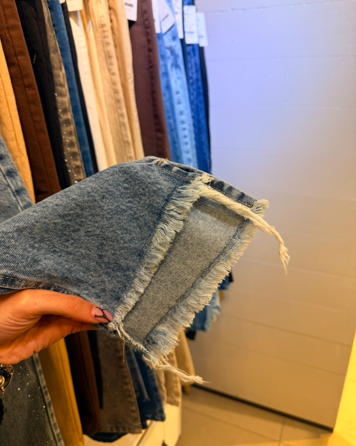 Jean rigido tiro alto de corte mom. Tiene un detalle de corte delantero en tobillos.