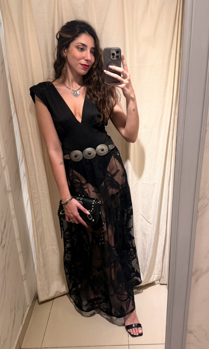 Pollera de encaje con elástico y lazo para regular la cintura.