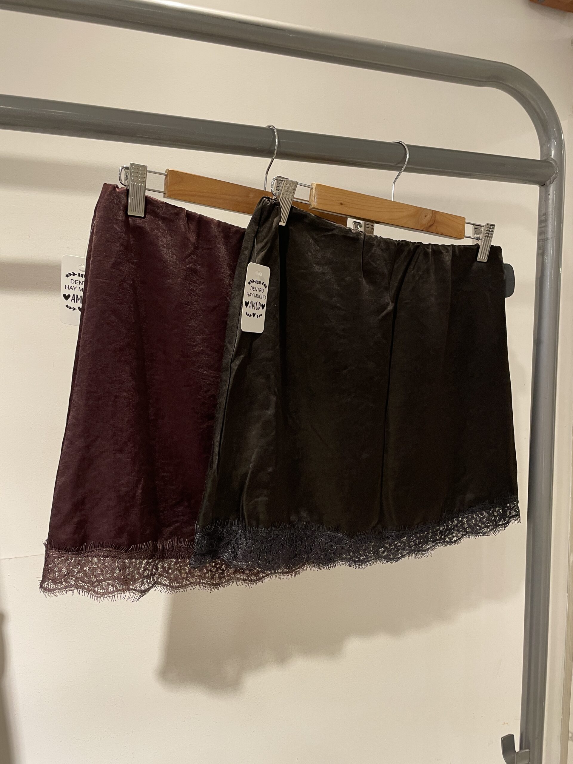 Pollera corta y rígida con puntilla.