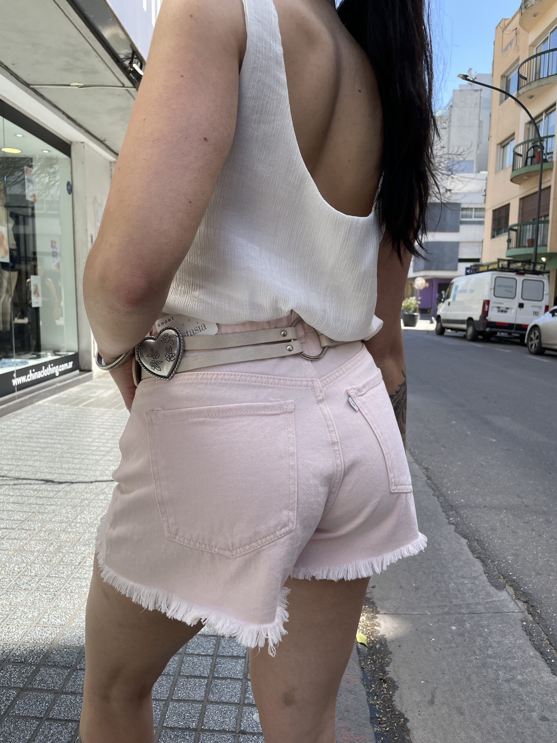Short desflecado de denim rígido.