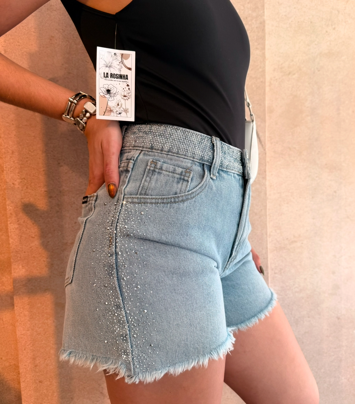 Short tiro alto de denim rígido con detalles hotfix.