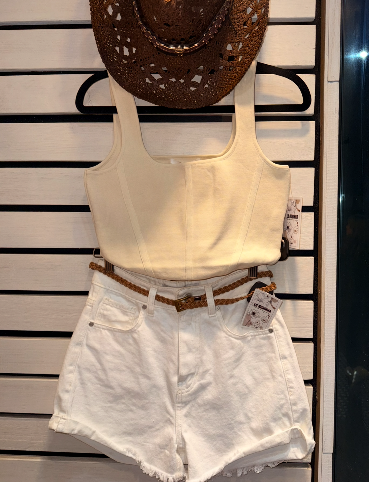 Top tejido de hilo con expandex. Talle único, equivalente a un S/M.