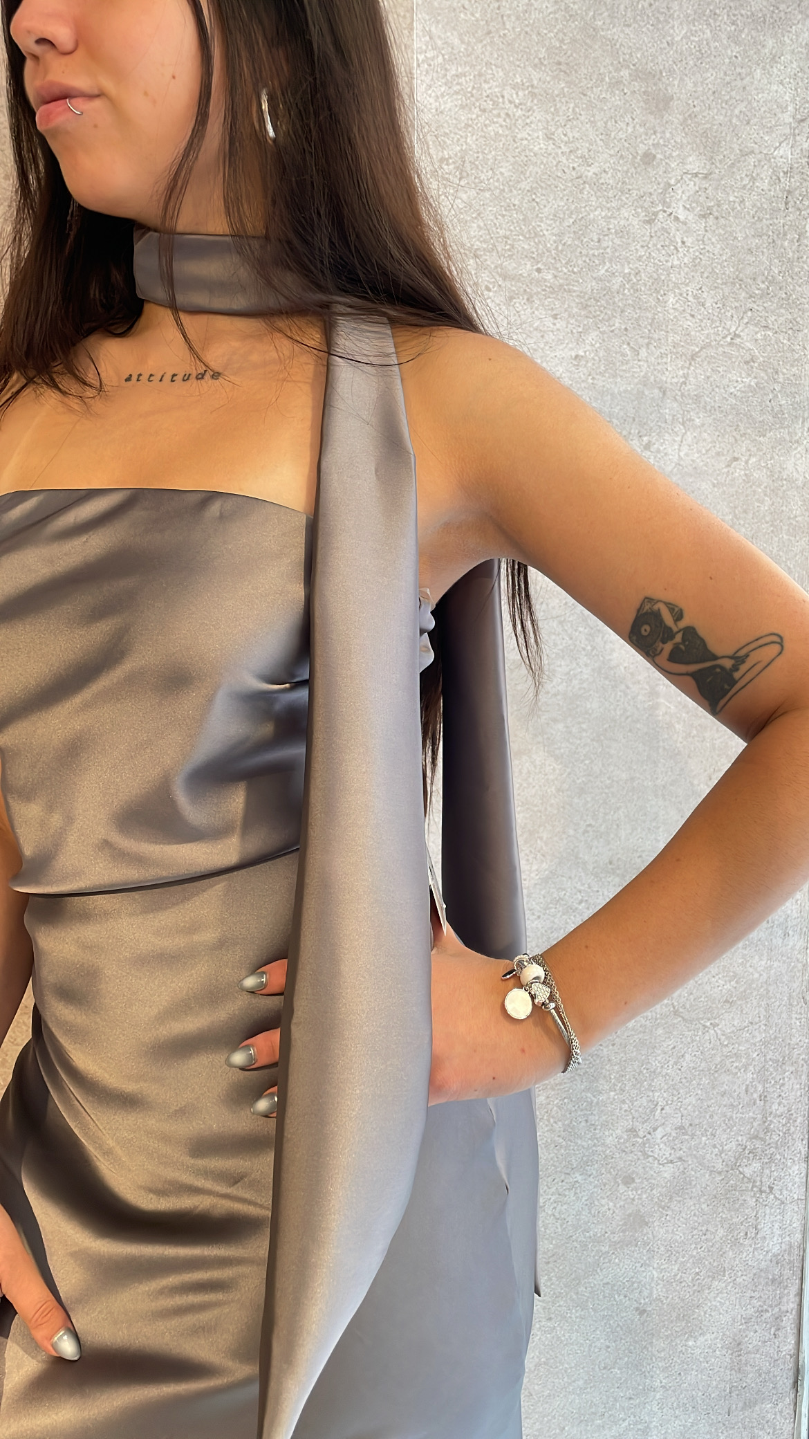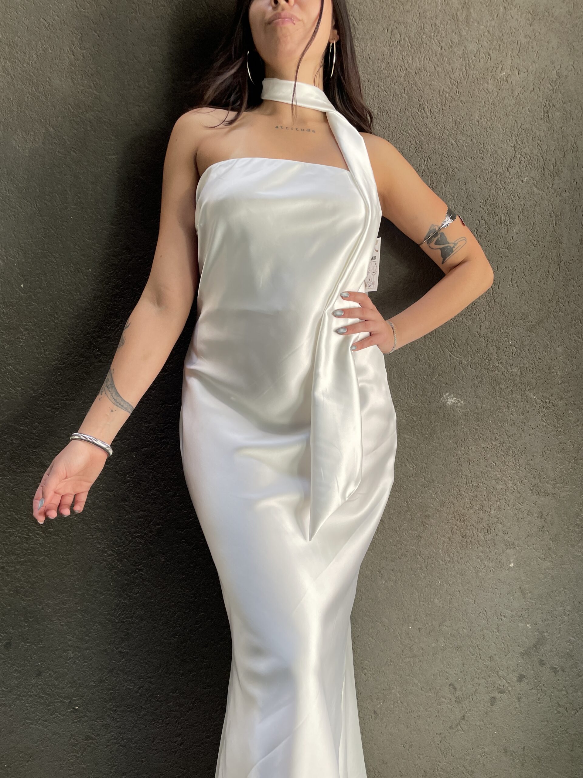 Vestido de satén corte strapless con ruedo delicado en la parte inferior.