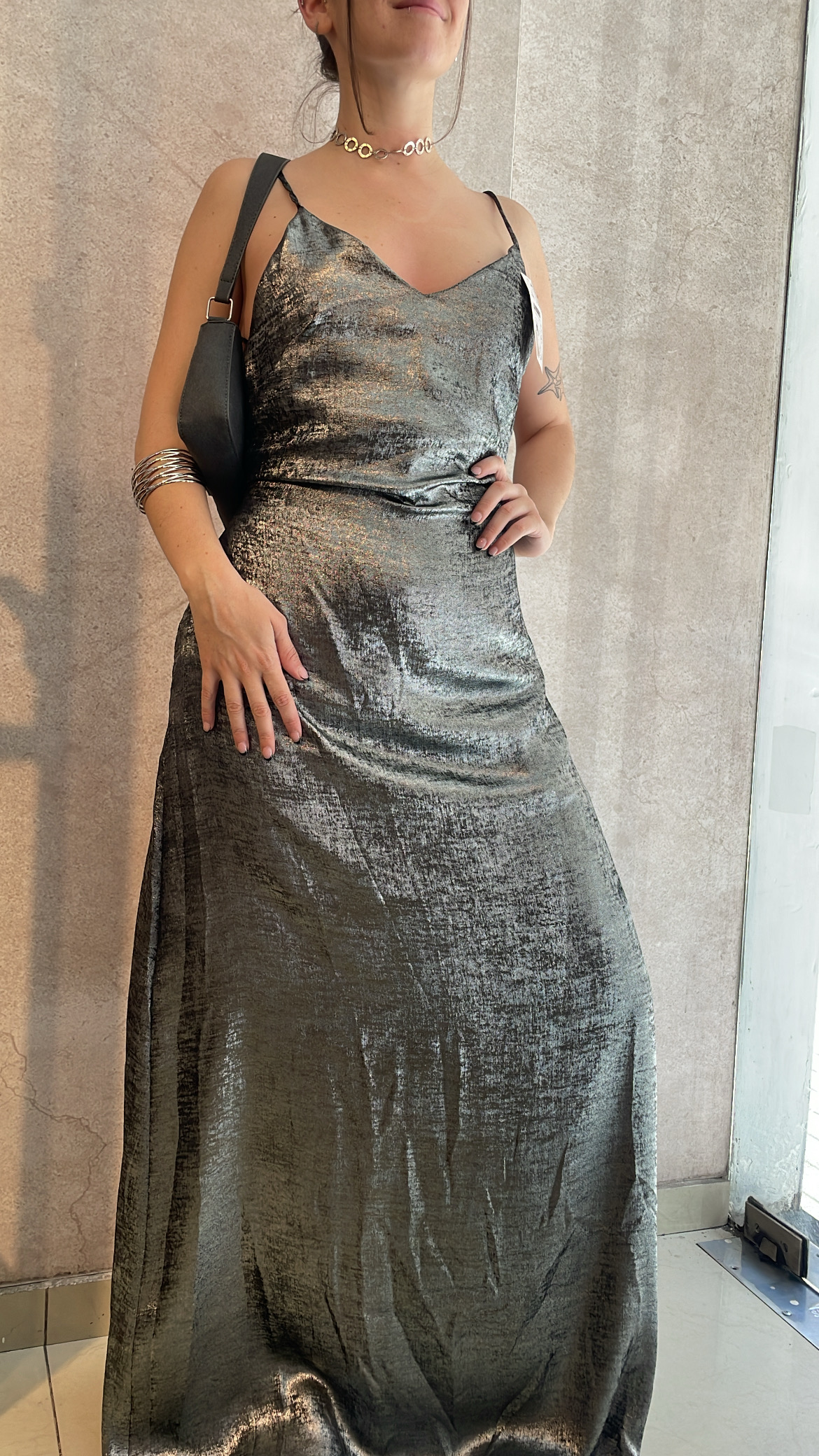 Vestido de satén forrado con lazo en la cintura.