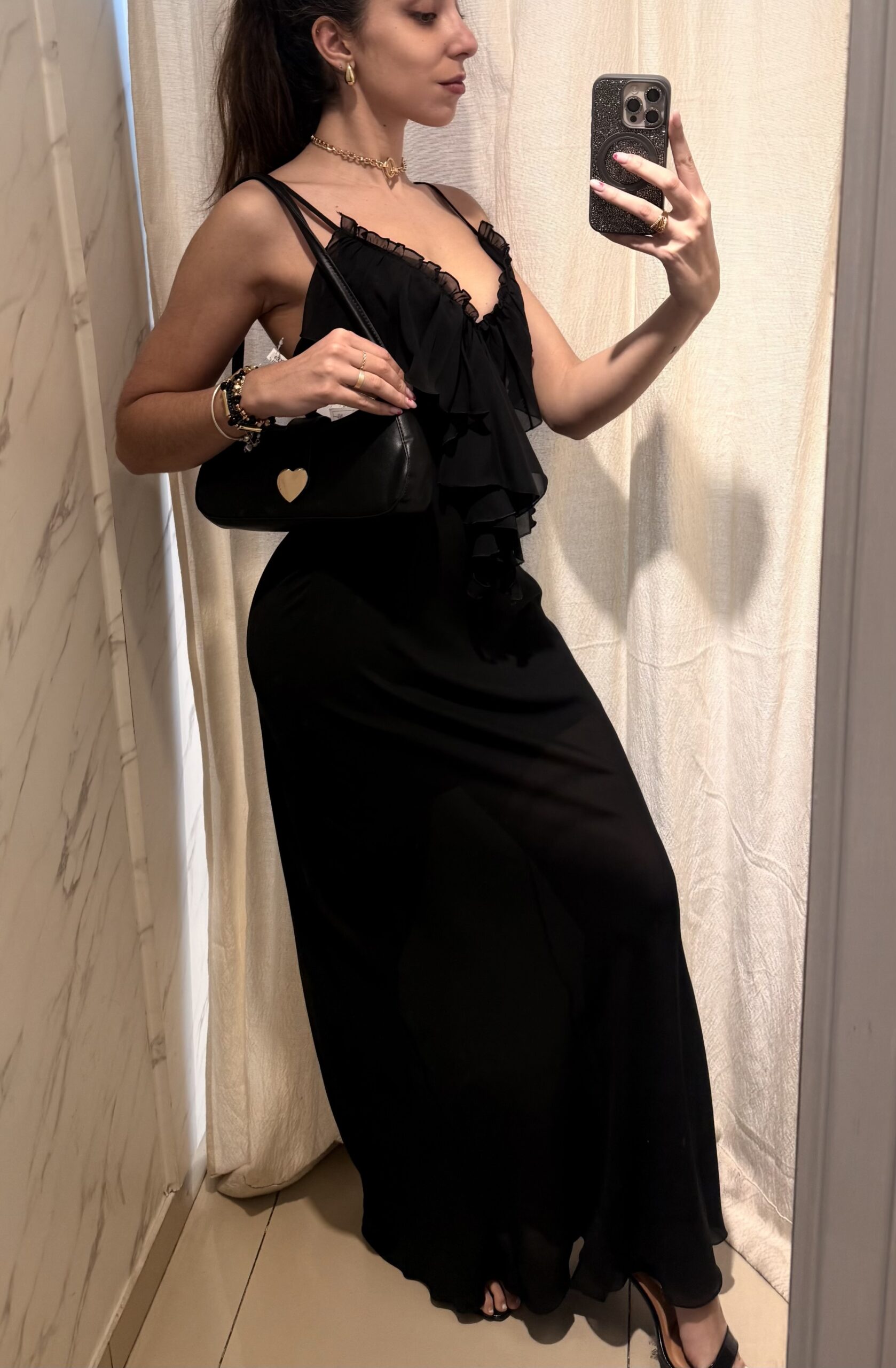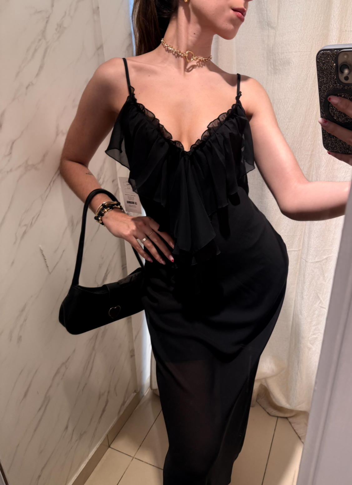 Vestido de gasa negro con forro por dentro, detalle de volados.